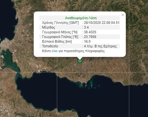 Συγκεκριμένα, στις 00:08, σύμφωνα με το Γεωδυναμικό Ινστιτούτο Αθηνών, σημειώθηκε σεισμός μεγέθους 3,4 βαθμών της κλίμακας Ρίχτερ, με επίκεντρο 3 χλμ βόρεια της Ερέτρειας και 15 χλμ ανατολικά της Χαλκίδας. Ο σεισμός είχε εστιακό βάθος στα 16 χλμ και έγινε αισθητός στις γύρω περιοχές.