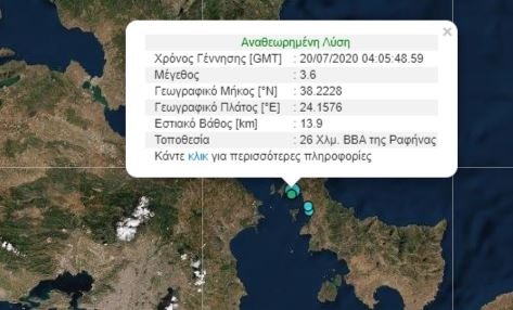 Σύμφωνα με το Γεωδυναμικό Ινστιτούτο Αθηνών, ο σεισμός σημειώθηκε 07:05 το πρωί, 26 χιλιόμετρα βόρεια, βορειοδυτικά της Ραφήνας, κοντά στην Εύβοια.