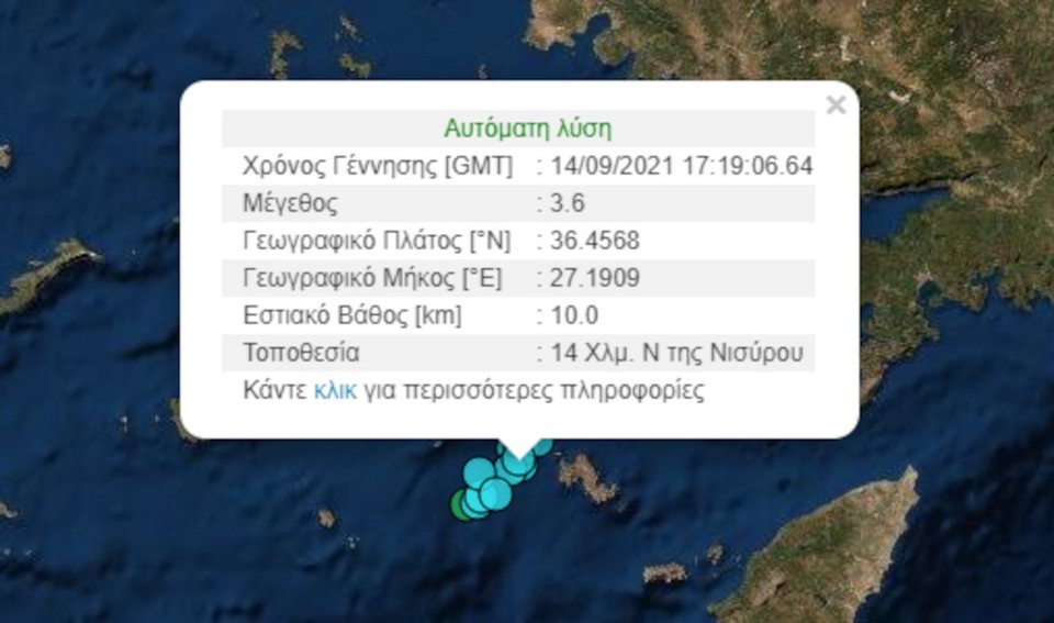 Συγκεκριμένα, ο πρώτος χρονικά σεισμός έγινε στις 20:19 και 6 δευτερόλεπτα σε θαλάσσια περιοχή 14 χιλιόμετρα νότια από τη Νίσυρο. Σύμφωνα με το Γεωδυναμικό Ινστιτούτο, είχε εστιακό βάθος 10 χιλιόμετρα.