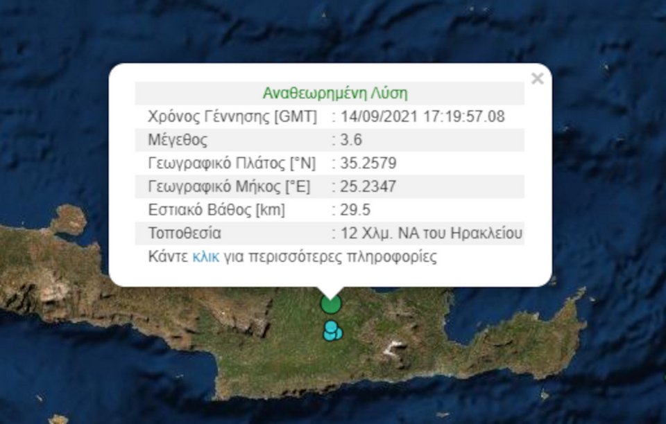 Ακολούθησε στις 20:19 και 57 δευτερόλεπτα σεισμική δόνηση στην περιοχή του δήμου Μινώα Πεδιάδος, στην Κρήτη, 12 χιλιόμετρα νοτιοανατολικά του Ηρακλείου, η οποία είχε εστιακό βάθος 29,5 χιλιόμετρα.
