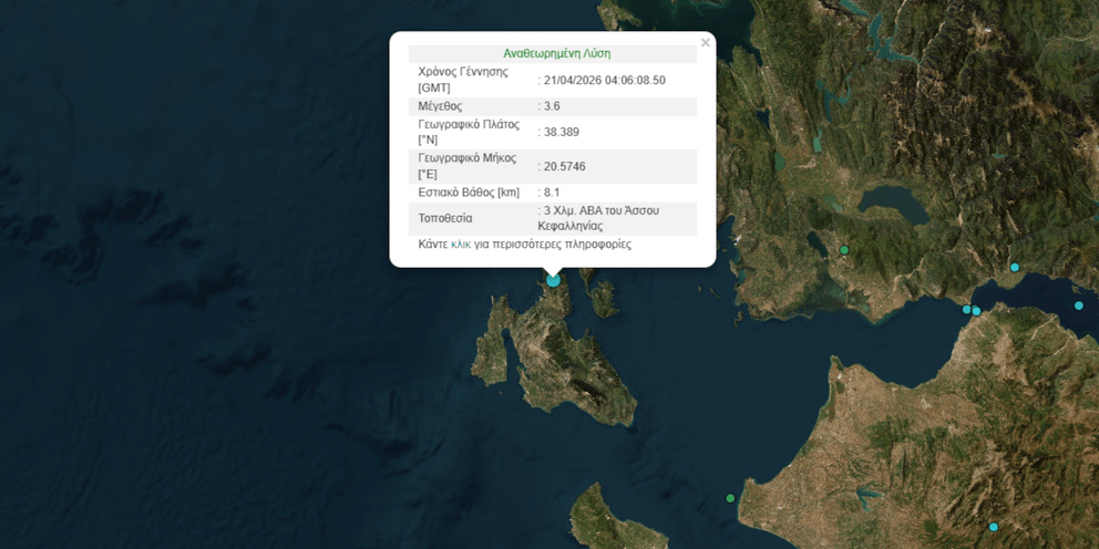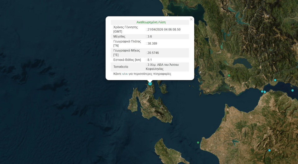 Σεισμός μεγέθους 3,6 Ρίχτερ ταρακούνησε σήμερα στις 07:06 την Κεφαλονιά και είχε επίκεντρο 3 χλμ ΑΒΑ του Άσσου στο νησί του Ιονίου.