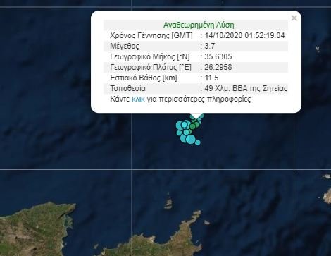 Ο σεισμός, σύμφωνα με το Γεωδυναμικό Ινστιτούτο Αθηνών, σημειώθηκε στις 04:52 και ήταν εντάσεως 3,7 βαθμών της κλίμακας Ρίχτερ. Το επίκεντρό του ήταν 49 χλμ βόρεια, βορειοδυτικά της Σητείας, σε θαλάσσια περιοχή μεταξύ Κρήτης και Καρπάθου. Πρόκειται για την ίδια περιοχή που έδωσε τις τελευταίες 48 ώρες αρκετούς σεισμούς, με μεγαλύτερο αυτόν των 5,2 Ρίχτερ.