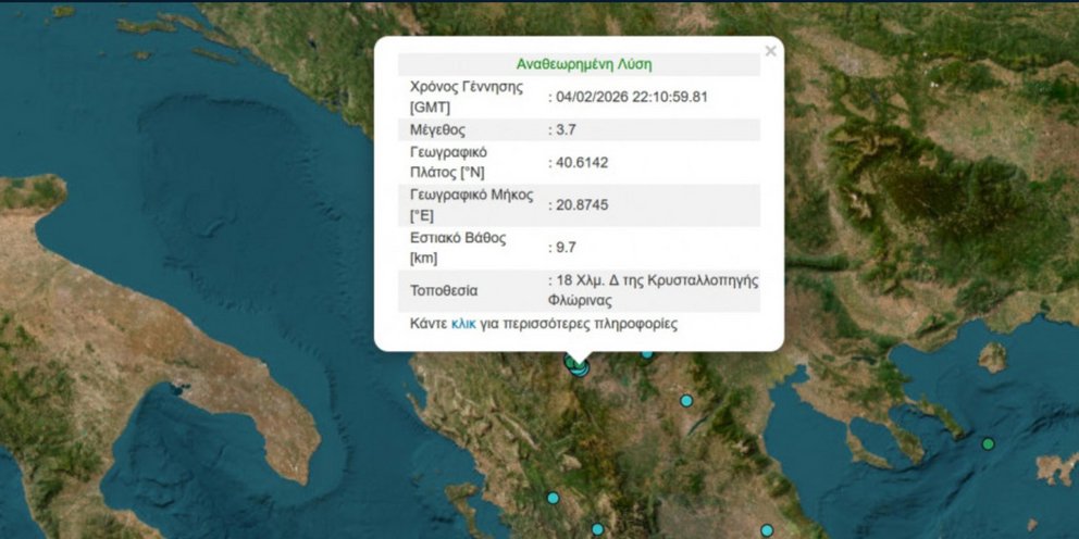 Σεισμική δόνηση μεγέθους 3,7 βαθμών της κλίμακας Ρίχτερ σημειώθηκε στις 00:10 μετά τα μεσάνυχτα (5/2) κοντά στην Μικρή Πρέσπα, στα Ελληνοαλβανικά σύνορα.