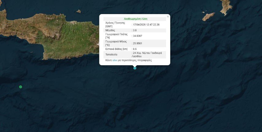 Σεισμός μεγέθους 3,8 βαθμών της κλίμακας Ρίχτερ σημειώθηκε στo Λασίθι το μεσημέρι της Παρασκευής.