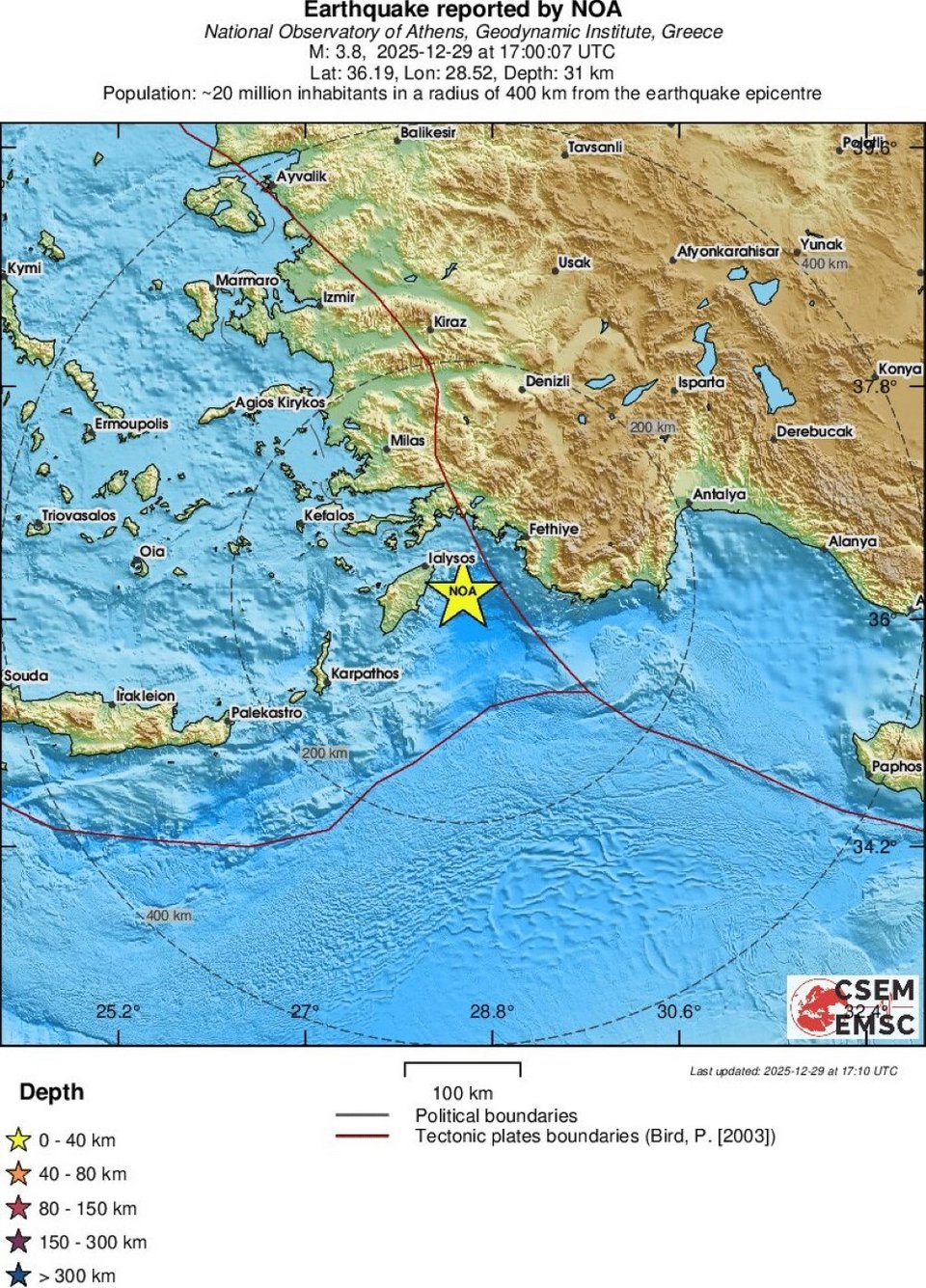 Από την πλευρά του, το Ευρωμεσογειακό Ινστιτούτο κάνει επίσης λόγο για σεισμό 3,9 Ρίχτερ, με το επίκεντρο της δόνησης να υπολογίζεται στα 38 χιλιόμετρα νοτιοανατολικά της Ρόδου, με το εστιακό βάθος να είναι στα 31 χιλιόμετρα.