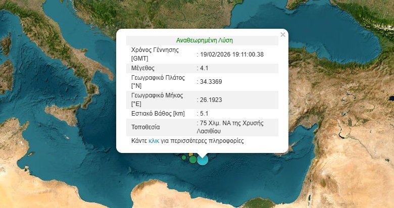 Σύμφωνα με το Γεωδυναμικό Ινστιτούτο του Εθνικού Αστεροσκοπείου Αθηνών, ο σεισμός έγινε 75χλμ ΝΑ της Χρυσής Λασιθίου, ενώ το εστιακό βάθος εκτιμάται στα 5,1 χιλιόμετρα.