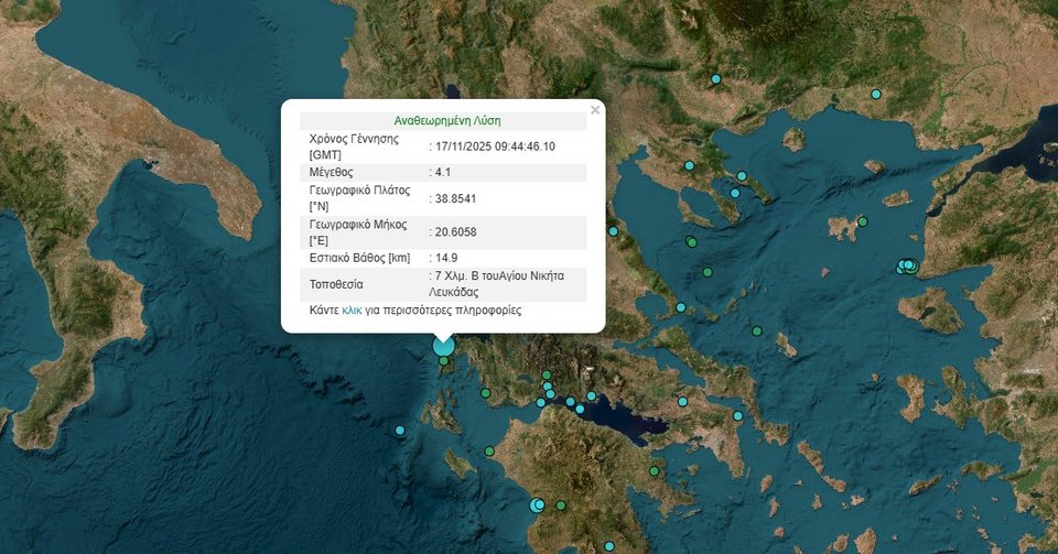 Σεισμός μεγέθους 4,1 Ρίχτερ σημειώθηκε σήμερα το μεσημέρι στην Λευκάδα.
