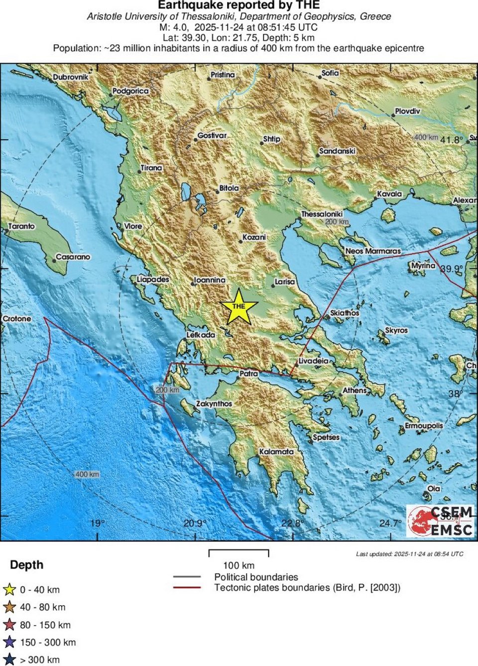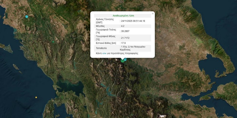 Από την πλευρά του, το Ευρωμεσογειακό Ινστιτούτο κάνει λόγο για σεισμό μεγέθους 4,7 Ρίχτερ 16 χιλιόμετρα νοτιοδυτικά της Καρδίτσας, με το εστιακό του βάθος να υπολογίζεται στα πέντε χιλιόμετρα.