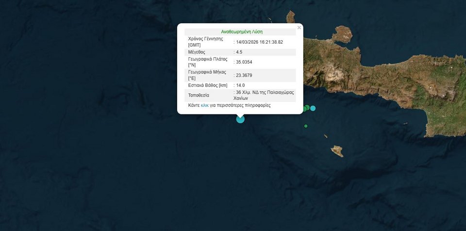 Από την πλευρά του, το Ευρωμεσογειακό Ινστιτούτο κάνει λόγο για σεισμό μεγέθους 4,7 Ρίχτερ, 55 χιλιόμετρα νότια νοτιοδυτικά της Παλαιοχώρας, με το εστιακό του βάθος να υπολογίζεται στα δέκα χιλιόμετρα.