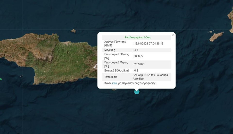 Συγκεκριμένα, σύμφωνα με το Γεωδυναμικό Ινστιτούτο Αθηνών, ο σεισμός έγινε στις 10:04 και είχε επίκεντρο θαλάσσια περιοχή 21χλμ νότια, νοτιοδυτικά του Γουδουρά Λασιθίου.