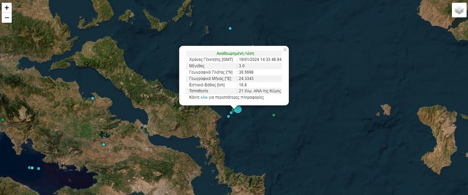 Στις 16:33 σημειώθηκε ακόμα μία δόνηση, μεγέθους 3 Ρίχτερ, στα 21 χλμ. ανατολικά-νοτιοανατολικά της Κύμης, με εστιακό βάθος 16,8 χιλιόμετρα.