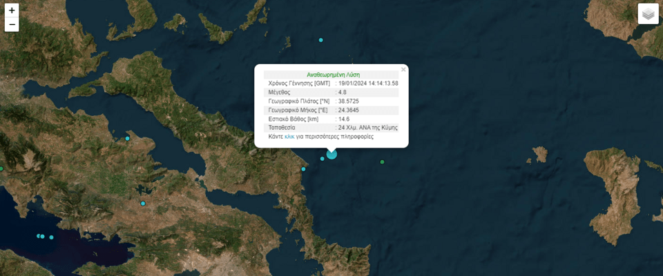 Το Ευρωμεσογειακό Σεισμολογικό Κέντρο υπολογίζει τη δόνηση σε μέγεθος 4,8 Ρίχτερ, με επίκεντρο 22 χιλιόμετρα ανατολικά της Κύμης.