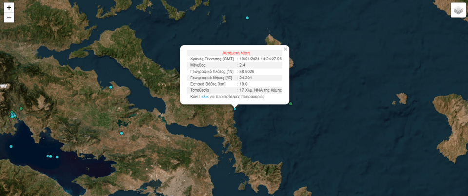 Σύμφωνα με το Γεωδυναμικό Ινστιτούτο, ο σεισμός σημειώθηκε στη θαλάσσια περιοχή 24 χιλιόμετρα ανατολικά της Κύμης και είχε εστιακό βάθος 14,6 χιλιόμετρα.