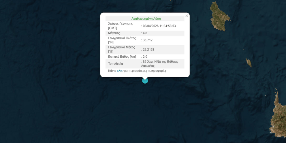 Σεισμός 4,8 Ρίχτερ μεταξύ Λακωνίας και Κρήτης σημειώθηκε στις 15:00 το μεσημέρι 85 Χλμ. ΝΝΔ της Βάθειας.