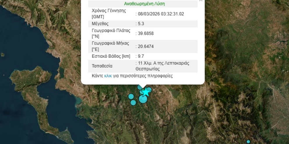 Σεισμός 5,3 βαθμών της κλίμακας Ρίχτερ σημειώθηκε κοντά στη Λεπτοκαριά Θεσπρωτίας, τα ξημερώματα της Κυριακής.