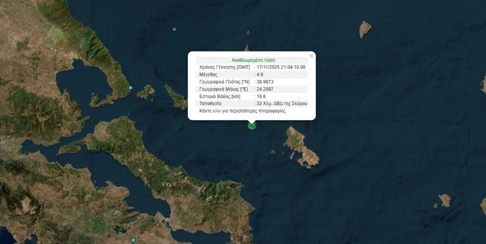 Σεισμός μεγέθους 4,6 βαθμών της κλίμακας Ρίχτερ σημειώθηκε στη Σκύρο το βράδυ της Δευτέρας, ο οποίος έγινε αισθητός και στην Αττική.