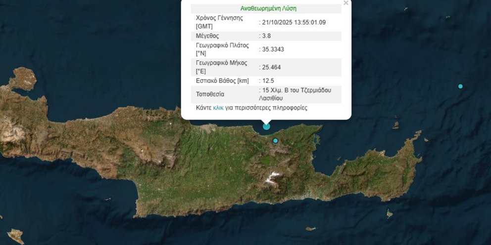 Σεισμική δόνηση μεγέθους 3,8 Ρίχτερ σημειώθηκε το απόγευμα της Τρίτης στο Λασίθι της Κρήτης.