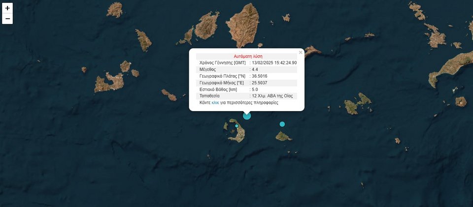 Δύο σεισμοί μεγέθους 4,4 βαθμών της κλίμακας Ρίχτερ σημειώθηκαν το απόγευμα της Πέμπτης στην περιοχή μεταξύ Αμοργού και Σαντορίνης.