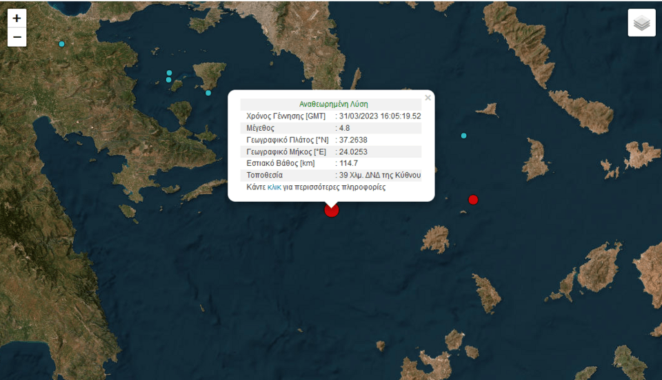 Ειδικότερα, εκ μέρους των τεσσάρων φορέων συγκρότησης του Ενιαίου Εθνικού Σεισμολογικού Δικτύου, το Γεωδυναμικό Ινστιτούτο του Εθνικού Αστεροσκοπείου Αθηνών ανακοινώνει ότι σήμερα, «στις 19:05 ώρα Ελλάδος, το σεισμολογικό δίκτυο κατέγραψε ασθενή σεισμική δόνηση με μέγεθος 4,8 στην κλίμακα Ρίχτερ». Ο σεισμός έγινε σε απόσταση 83 χλμ νότια, νοτιοανατολικά των Αθηνών.