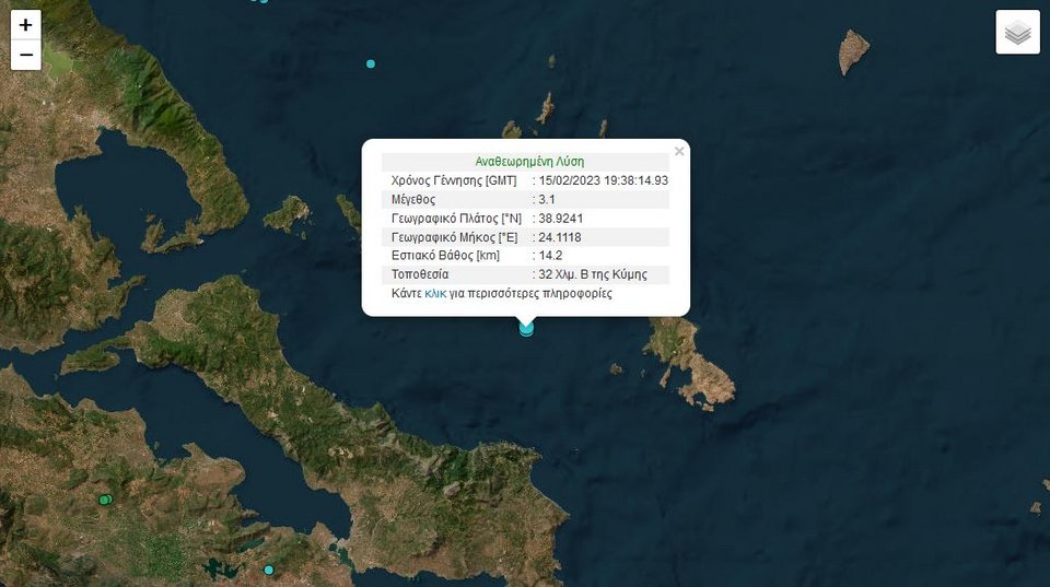 Λίγο αργότερα, στις 21:38, σημειώθηκε η δεύτερη δόνηση, μεγέθους 3,1 Ρίχτερ, που καταγράφηκε με επίκεντρο 32 χλμ. βόρεια της Κύμης, σε εστιακό βάθος 14,2 χιλιομέτρων.