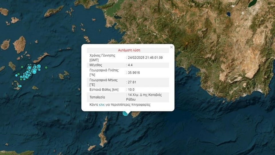 Σεισμός σημειώθηκε στη Ρόδο λίγο πριν από τα μεσάνυχτα της Δευτέρας (25/2).