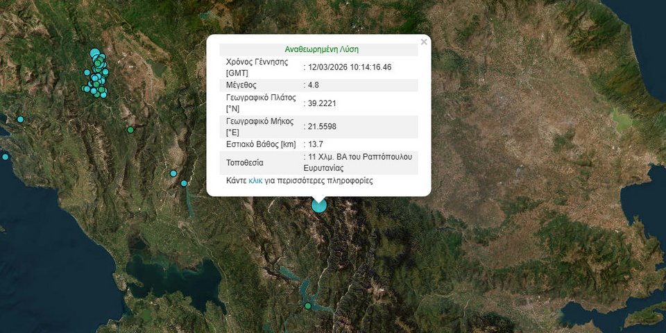 Σεισμική δόνηση 4,8 Ρίχτερ σημειώθηκε λίγο μετά τις 12 το μεσημέρι στην Ευρυτανία.
