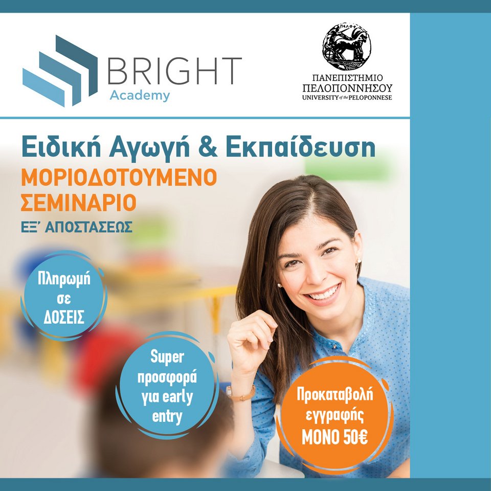 Η Bright Academy, στο πλαίσιο της διαρκούς εκπαίδευσης και αφουγκραζόμενη τις εκπαιδευτικές ανάγκες, υλοποιεί σε συνεργασία με το Πανεπιστήμιο Πελοποννήσου μοριοδοτούμενα σεμινάρια στην Ειδική Αγωγή.