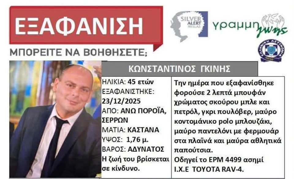 Η εξαφάνιση του 45χρονου άντρα δηλώθηκε στο Αστυνομικό Τμήμα Πορροΐων από τη σύζυγό του, όταν διαπιστώθηκε ότι απουσίαζε από το σπίτι για περισσότερες από 24 ώρες, χωρίς να έχει εμφανιστεί ούτε στην υπηρεσία του.