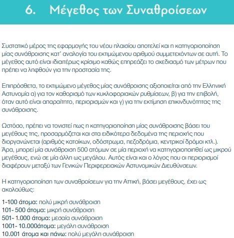 Ωστόσο, πρέπει να τονιστεί πως η κατηγοριοποίηση μιας συνάθροισης βάσει του μεγέθους της προσαρμόζεται και στα ειδικότερα δεδομένα της περιοχής που διοργανώνεται (αριθμός κατοίκων, οδόστρωμα, πεζοδρόμια, κεντρικοί δρόμοι κ.λπ.). «Άρα, μπορεί μία συνάθροιση 500 ατόμων σε μία περιοχή να κατηγοριοποιηθεί ως μικρού μεγέθους, ενώ σε μία άλλη ως μεγάλου. Αυτός είναι και ο λόγος που οι περιορισμοί διαφέρουν μεταξύ των Γενικών Περιφερειακών Αστυνομικών Διευθύνσεων», σημειώνεται.