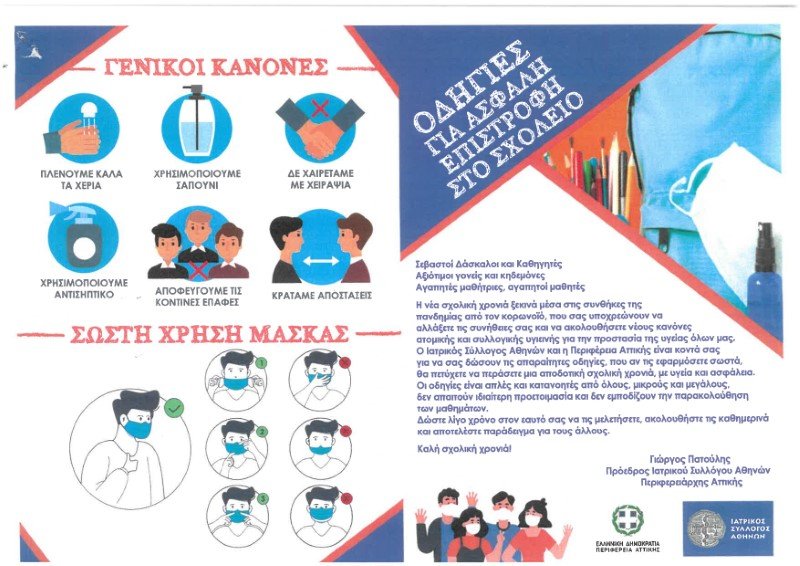 «Η νέα σχολική χρονιά ξεκινά μέσα στις συνθήκες της πανδημίας από τον κορωνοϊό, που σας υποχρεώνουν να αλλάξετε τις συνήθειές σας και να ακολουθήσετε νέους κανόνες ατομικής και συλλογικής υγιεινής για την προστασία της υγείας όλων μας. Ο ΙΣΑ και η Περιφέρεια Αττικής είναι κοντά σας γι ανα σας δώσουν τις απαραίτητες οδηγίες που αν τις εφαρμόσετε σωστά, θα πετύχετε να περάσετε μια αποδοτική σχολική χρονιά, με υγεία και ασφάλεια. Οι οδηγίες είναι απλές και κατανοητές απ' όλους, μικρούς και μεγάλους, δεν απαιτούν ιδιαίτερη προετοιμασία και δεν εμποδίζουν την παρακολούθηση των μαθημάτων.»