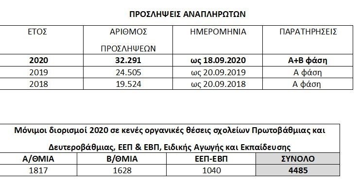 δ) να διατεθούν πρόσθετα κονδύλια για προσλήψεις εκπαιδευτικών. Οι έως τώρα προσλήψεις αναπληρωτών ανέρχονται στις 32.291, ενώ προετοιμάζουμε και τρίτη φάση εντός των επόμενων ημερών. Συγκριτικά, τα τελευταία χρόνια: