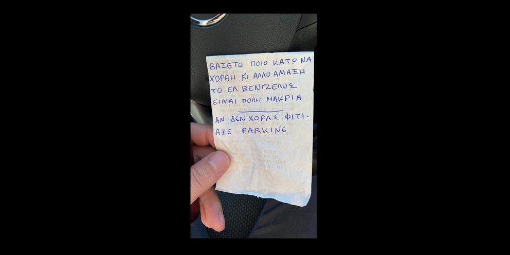 Με μια γραφή που παραπέμπει στην… ελληνική θέλησε κάποιος να βάλει στη θέση του τον ιδιοκτήτη ενός σταθμευμένου οχήματος.