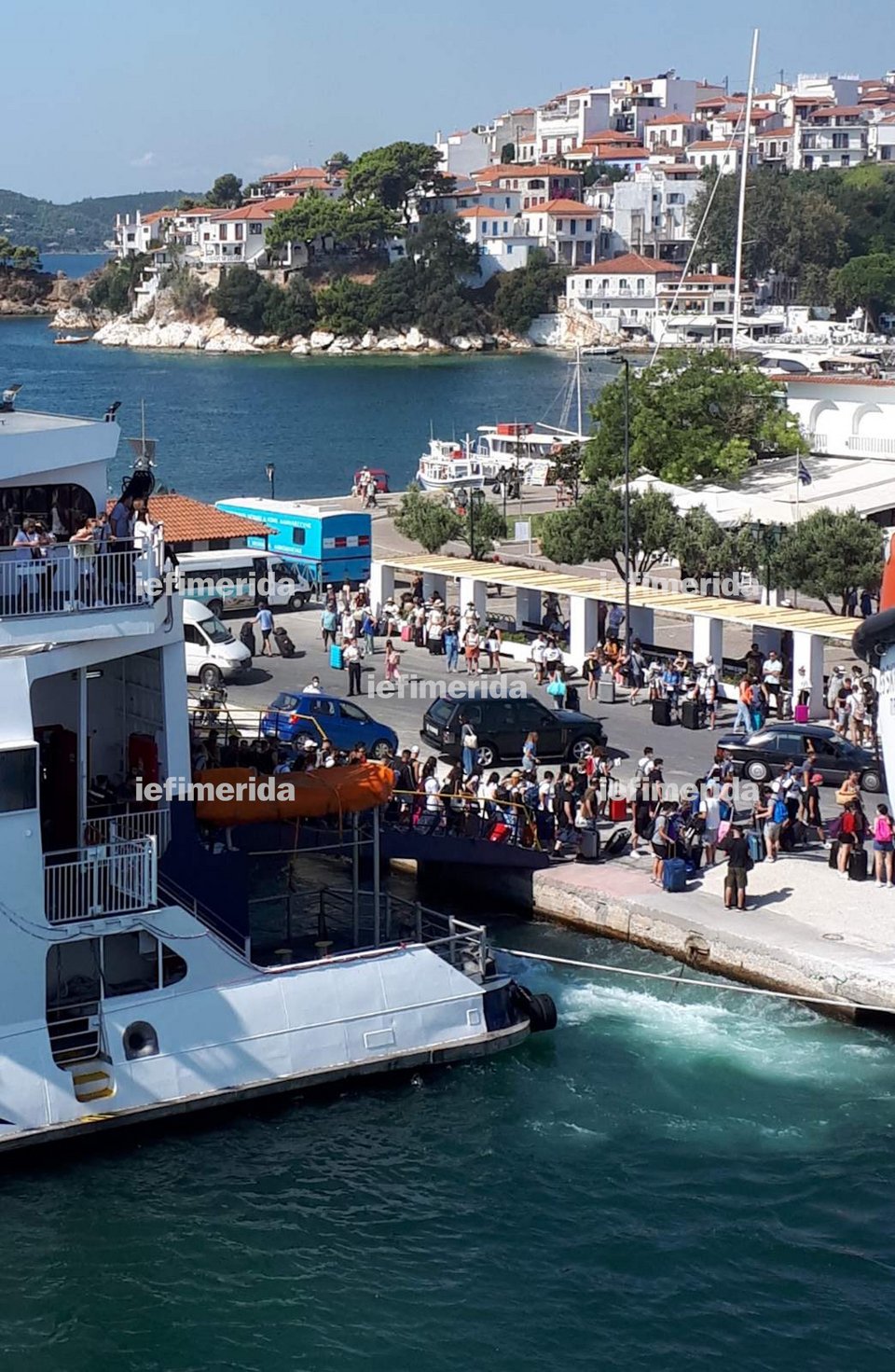 Λίγο μετά τις 10 το πρωί τα πλοία έδεσαν στο λιμάνι της Σκιάθου και μόλις κατέβηκαν οι μπουκαπόρτες, έγινε απόβαση τουριστών στο νησί.