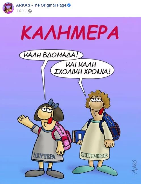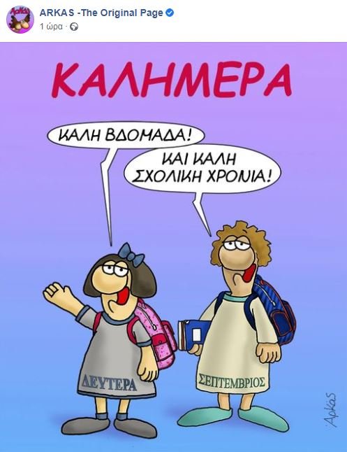 Νωρίς το πρωί αναρτήθηκε η παρακάτω εικόνα, με την οποία ο σκιτσογράφος εύχεται «καλή σχολική χρονιά».
