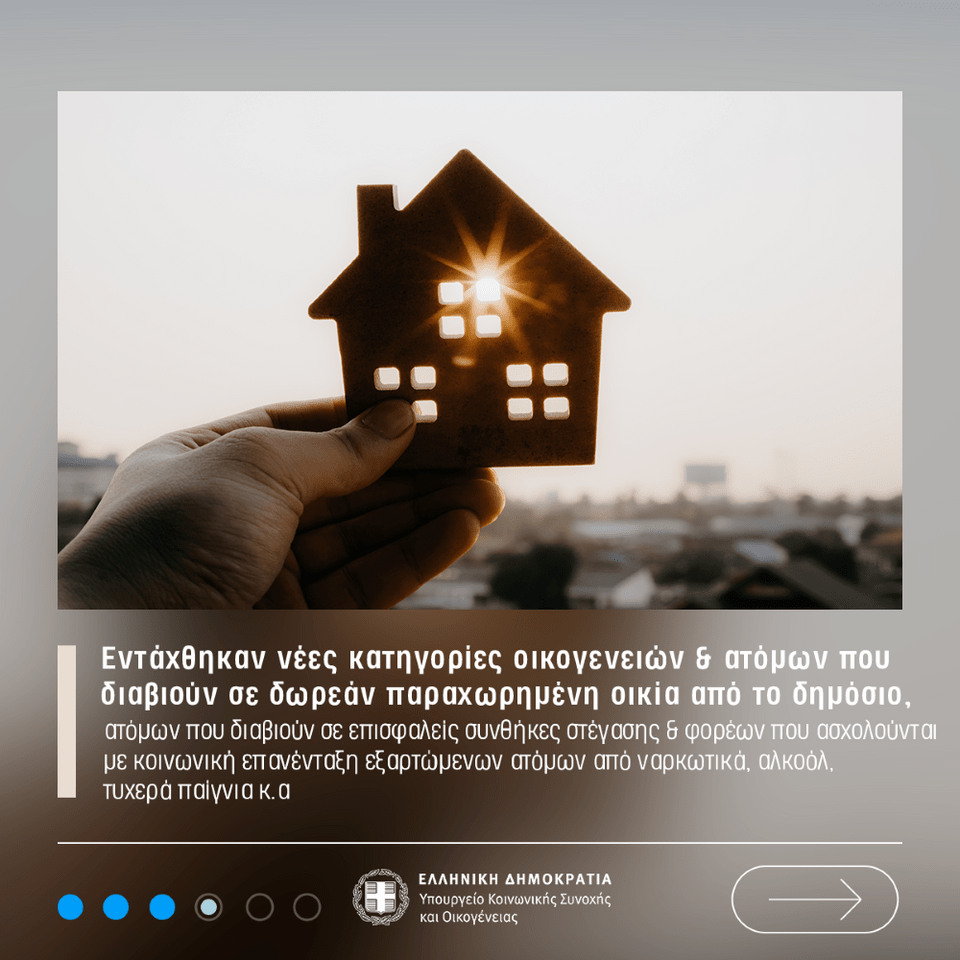 - Οικογένειες και άτομα που διαβιούν σε δωρεάν παραχωρημένη οικία από φορέα Γενικής Κυβέρνησης.