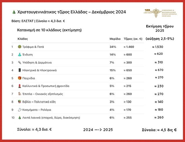 Μια εκτίμηση του «χριστουγεννιάτικου τζίρου» για το 2025 ανά κλάδο στην Ελλάδα δείχνει πως θα κυμανθεί κοντά στα 4,5 δις ευρώ. Μια «προσεγγιστική» ανάλυση σε 10 κλάδους δείχνει πως και φέτος με μερίδιο 34% στα τρόφιμα και ποτά θα δαπανηθούν τα περισσοτέρα με περίπου 1,53 δις ευρώ. Στην ένδυση με μερίδιο 14% περίπου 620 εκατ. ευρώ και στην υπόδηση με 7% περίπου 310 εκατ. ευρώ Στα ηλεκτρικά και ηλεκτρονικά είδη με μερίδιο 15% περίπου 670 εκατ. ευρώ. Στα παιχνίδια με μερίδιο 6% περίπου 270 εκατ. ευρώ. Στα καλλυντικά με μερίδιο 5% περίπου 230 εκατ. ευρώ. Στον οικιακό εξοπλισμό με μερίδιο 6% περίπου 270 εκατ. ευρώ. Στα βιβλία και πολιτιστικά είδη με μερίδιο 3% περίπου 140 εκατ. ευρώ. Σε κοσμήματα και ρολόγια με μερίδιο 4% περίπου 180 εκατ. ευρώ. Τέλος για τα υπόλοιπα, εποχικά δώρα και είδη διακόσμησης με μερίδιο 6% περίπου 260 εκατ. ευρώ.