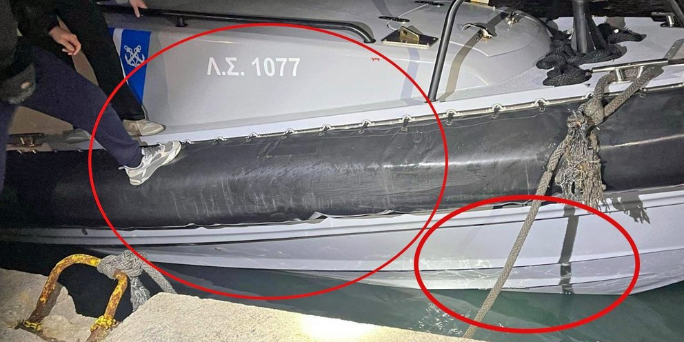 Το Λιμενικό έδωσε στη δημοσιότητα φωτογραφίες του σκάφους, όπου είναι εμφανή τα σημάδια της σύγκρουσης και, σύμφωνα με πληροφορίες, έχει προκληθεί ρήγμα.
