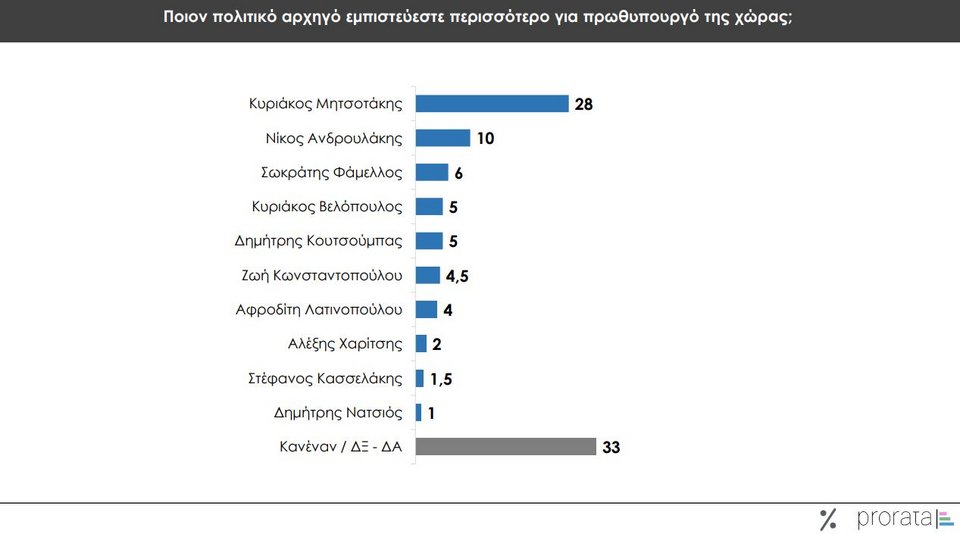 Ο Κυριάκος Μητσοτάκης προηγείται σταθερά στο ερώτημα «ποιον εμπιστεύεστε περισσότερο για πρωθυπουργό» καθώς συγκεντρώνει ποσοστό 28%, με τον Νίκο Ανδρουλάκη να ακολουθεί με 10%. Πιο πίσω βρίσκεται ο Σωκράτης Φάμελλος, ενώ αξιοσημείωτο είναι πως ο Στέφανος Κασσελάκη είναι 9ος στους 10 με 1,5% πίσω μόνο από τον Δημήτρη Νατσιό.