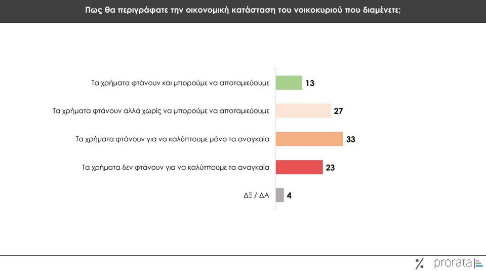Για τα οικονομικά στο νοικοκυριό, το 40% λέει ότι τα βγάζει πέρα, είτε αποταμιεύει χρήματα, είτε όχι, ενώ το 56% λέει πως δεν τα βγάζει πέρα ή καλύπτει μόνο τα αναγκαία.