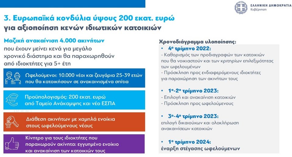 Η δράση αφορά τη χρηματοδότηση μαζικής ανακαίνισης και ενεργειακής αναβάθμισης 4.000 ακινήτων που έχουν μείνει κενά για μεγάλο χρονικό διάστημα, σε συνεργασία με τους ιδιοκτήτες τους, για την άμεση διάθεσή τους ως προσιτές κατοικίες σε νέους και νέα ζευγάρια. Το μέτρο θα ωφελήσει τόσο τους νέους που θα στεγαστούν σε αυτές, όσο και τους ιδιοκτήτες των ακινήτων οι οποίοι θα εξασφαλίσουν εγγυημένο εισόδημα και αναβάθμιση των ακινήτων τους. Από τη δράση αναμένεται να ωφεληθούν 10.000 νέοι και νέα ζευγάρια, ηλικίας 25-39 ετών.