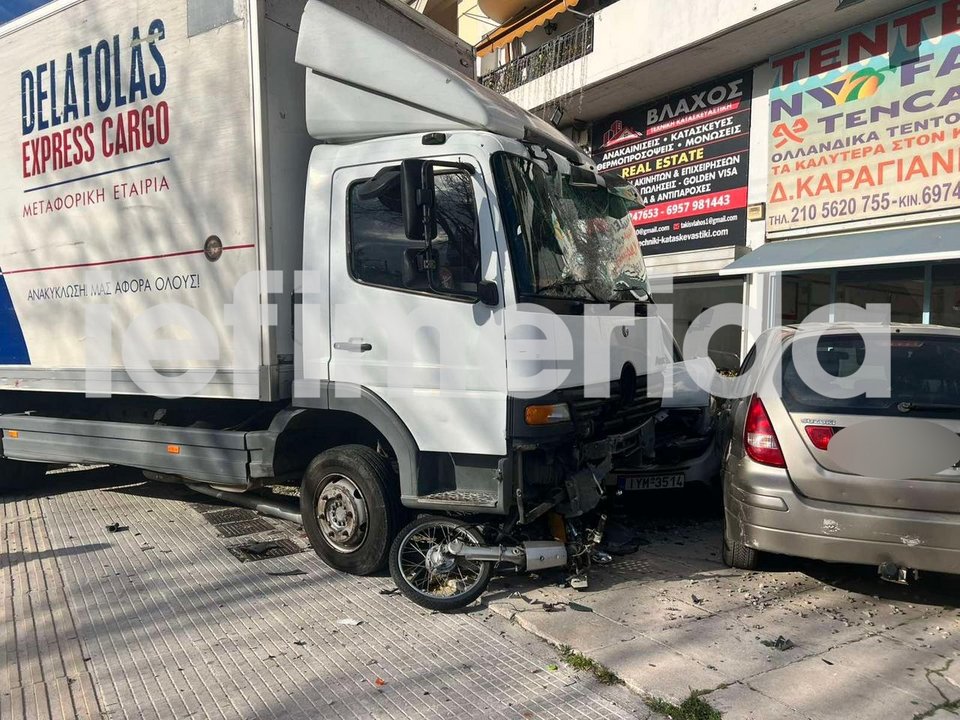 Λες και έσκασε βόμβα θυμίζει το σημείο όπου σημειώθηκε το τροχαίο ατύχημα στη λεωφόρο Θηβών, όταν ένα φορτηγό έπεσε πάνω σε σταθμευμένα οχήματα.