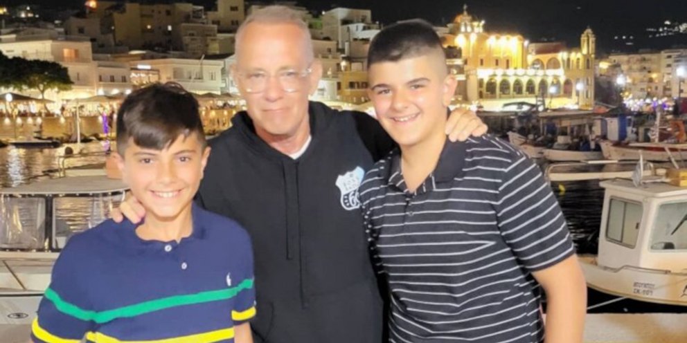 Απλός, προσιτός και ιδιαίτερα φιλικός, ο Τόμ Χανκς περπάτησε στο λιμάνι του νησιού, μίλησε και φωτογραφήθηκε με όσους τον αναγνώρισαν. Στην φωτογραφία που δημοσιεύει το τοπικό σάιτ, ο Τομ Χανκς ποζάρει με τα εγγόνια του δημάρχου Καρπάθου κ. Νισύριου, τον Γιάννη και τον Περικλή.