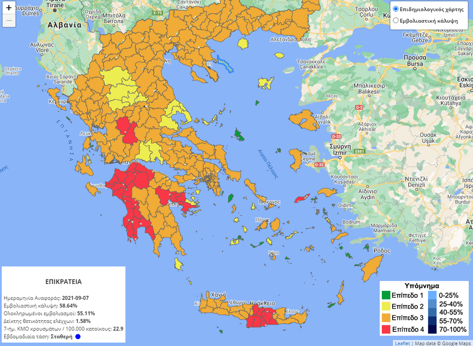 Στο «κόκκινο», επίπεδο 4 του Επιδημιολογικού Χάρτη της χώρας, εντάσσονται οι Περιφερειακές Ενότητες Αργολίδας και Ευρυτανίας.