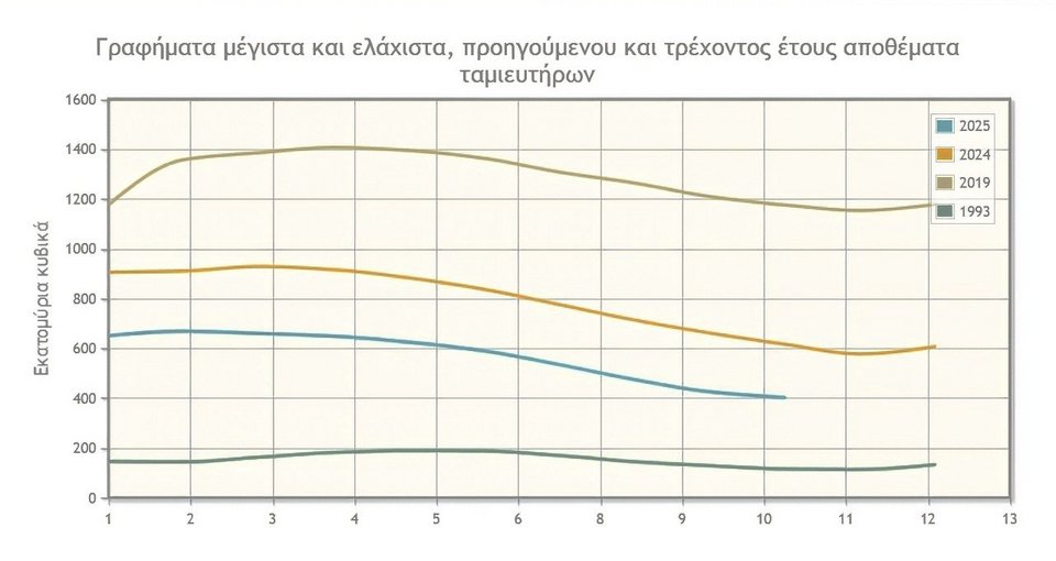 Όπως αποτυπώνεται στο γράφημα που ακολουθεί, μόλις πριν δύο χρόνια, το φθινόπωρο του 2023, τα διαθέσιμα αποθέματα ξεπερνούσαν το 1,4 δισ. κυβικά, ενώ σήμερα έχουν κατρακυλήσει κάτω από το μισό!