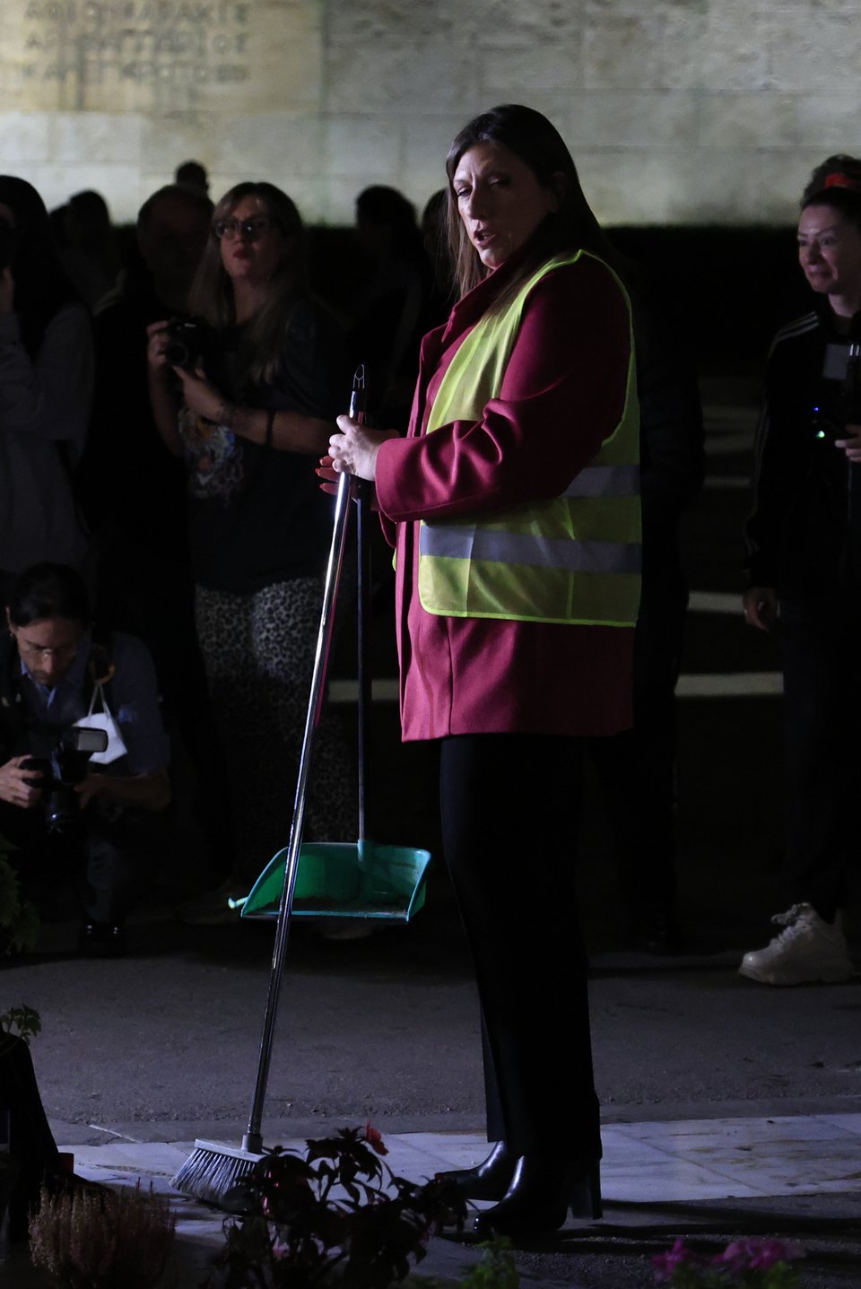 Μάλιστα, η πρόεδρος της Πλεύσης Ελευθερίας φόρεσε ένα κίτρινο γιλέκο, πήρε σκούπα και φαράσι και βοήθησε στον καθαρισμό του χώρου, όπως και ο Πάνος Ρούτσι.