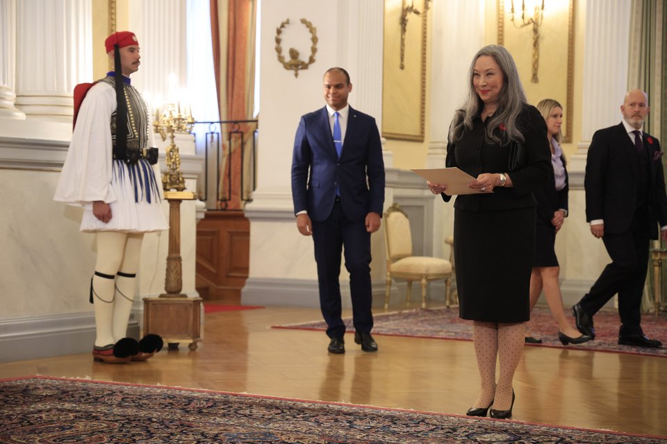 Μετά την επίδοση των διαπιστευτηρίων είχε σύντομο διάλογο με τον κ. Τασούλα. Ο Πρόεδρος της Δημοκρατίας τη ρώτησε αν έχει έρθει προηγουμένως στην Ελλάδα, με την ίδια να απαντά ότι έχει επισκεφθεί την Ύδρα και κάποια νησιά.