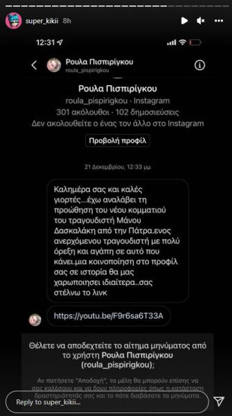 «Καλημέρα σας και καλές γιορτές. Έχω αναλάβει την προώθηση του νέου κομματιού του τραγουδιστή Μάνου Δασκαλάκη από την Πάτρα, ενός ανερχόμενου τραγουδιστή με πολλή όρεξη και αγάπη σε αυτό που κάνει. Μία κοινοποίηση στο προφίλ σας σε ιστορία θα μας χαροποιήσει ιδιαίτερα. Σας στέλνω το λινκ».