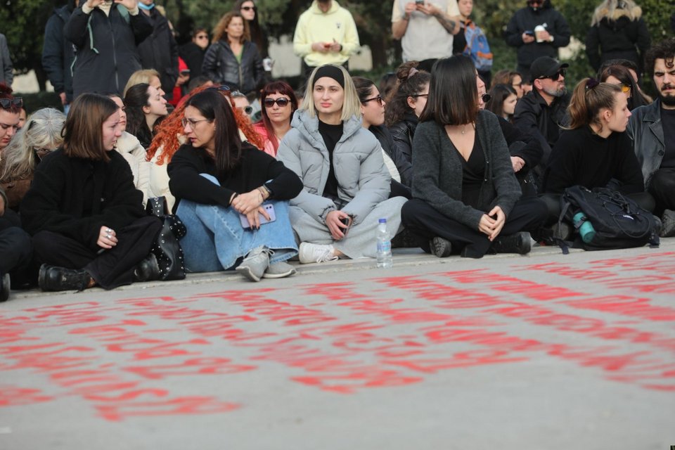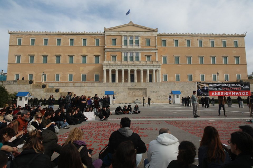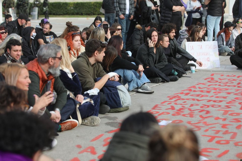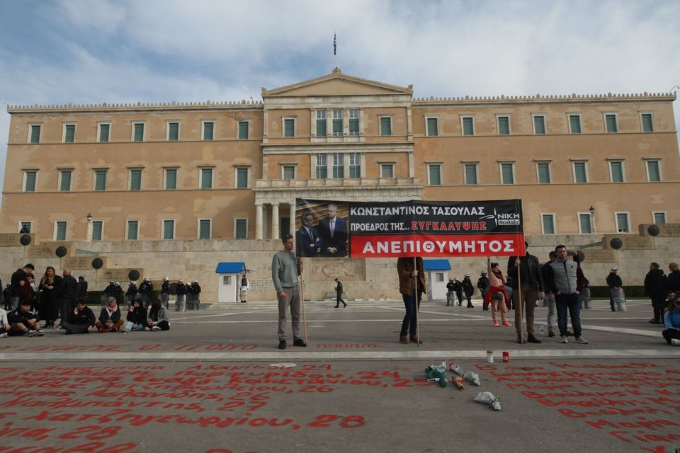Στο πλαίσιο της συγκέντρωσης έγραψαν τα ονόματα των 57 νεκρών με κόκκινη μπογιά στην πλατεία Συντάγματος:
