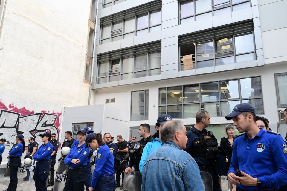 Κατά πληροφορίες περίπου 100 άτομα βρίσκονται έξω από το κτίριο, πετώντας τρικάκια. Στο σημείο υπάρχουν πανό εκ των οποίων το ένα ανήκει στον Ρουβίκωνας.