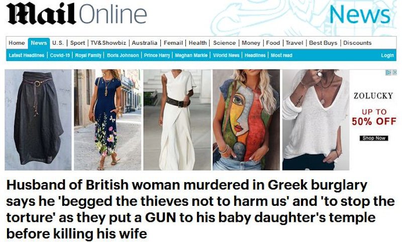 Στο δημοσίευμα με τίτλο «Ο σύζυγος της Βρετανίδας που δολοφονήθηκε στη διάρρηξη στην Ελλάδα λέει ότι ''εκλιπαρούσε τους κλέφτες να μη μας βλάψουν'' και ''να σταματήσουν τα βασανιστήρια'', καθώς έβαλαν το όπλο στον κρόταφο της κορούλας τους προτού σκοτώσουν τη γυναίκα του», η βρετανική εφημερίδα παραθέτει τις δηλώσεις του 33χρονου πιλότου για τον εφιάλτη που έζησαν: «Το μωρό έκλαιγε, η γυναίκα μου έκλαιγε και κάποιος ή κάποιοι έψαχναν στο σπίτι για να βρουν κι άλλα χρήματα και κοσμήματα (…) Ικετεύαμε τους κλέφτες να μην μας βλάψουν, τους είπαμε πού ήταν τα χρήματα και τους παρακαλέσαμε να μας αφήσουν ήσυχους (…) Εύχομαι κανείς να μην περάσει όσα εμείς. Ήταν ένας εφιάλτης. Η αστυνομία θα τους πιάσει».